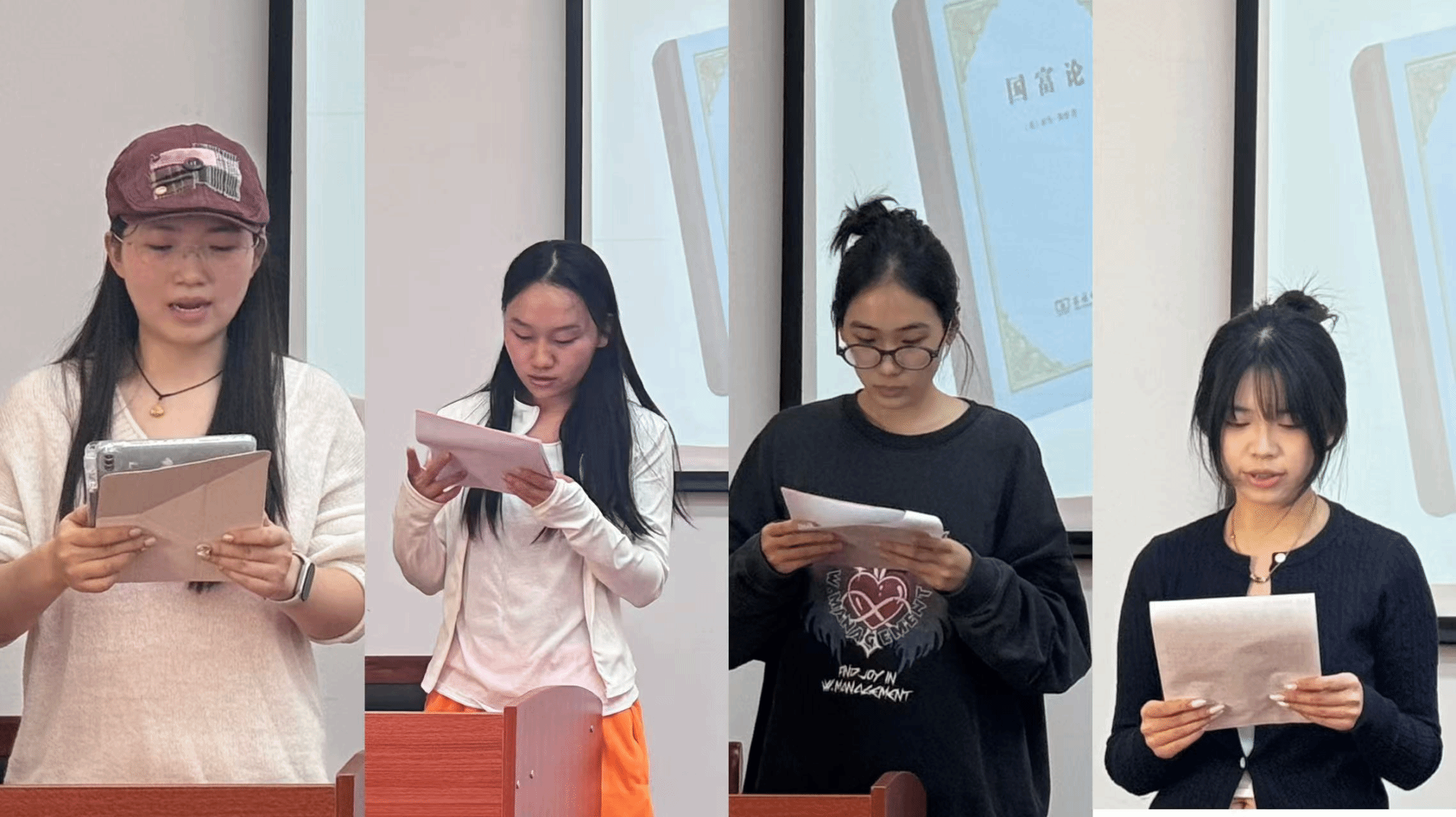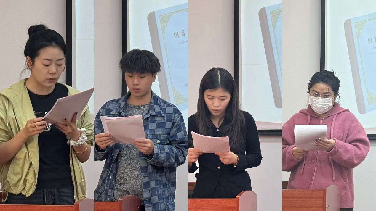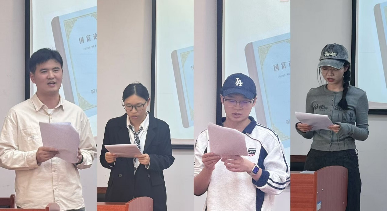 随后,同学们依次进行读书分享。首先,谌思琦同学通过解读《国富论》第四篇,感悟到斯密对重商主义的深刻批判,他揭示了贸易保护的本质局限,论证了“看不见的手”在自由市场中的核心作用——个人追求利益能自发促进社会整体繁荣。这启示我们,经济繁荣的根基在于尊重市场规律与个体自由,而非人为干预。黄敬红同学通过对《国富论》第三篇的分析,指出:斯密在两百五十年前的这番剖析,其穿透历史的智慧,至今依然为我们理解国家繁荣与个人自由的真谛,提供着不竭的启示,在全球化面临挑战、制度竞争力剧的今天,重读斯密对中世纪城市兴起的分析,不仅能加深我们对历史的理解,更能为我们思考当代问题提供宝贵的历史视角和理论资源。曹孟杰同学从工资上升叙事与“财富扩散”概念出发,分享关于第一篇第八节《论劳动工资》的一些感悟,她指出,当下技术工人薪资攀升现象——这绝非孤立现象,而是“财富扩散”机制的生动体现。当资本积累突破临界点,利润自然会像水流渗透土壤般惠及劳动者,这种扩散不仅是经济规律,更构成了社会和谐的基石。这启示青年,个人收入与国家发展同频共振。与其焦虑内卷,不如深耕朝阳行业,乘时代之势而上——当社会财富的潮水上涨时,每叶扁舟都会随之升高。周颖同学深度剖析了第一篇中分工与效率的内在逻辑后指出,当代青年应该在专业领域深耕细作,培养不可替代的专长,同时保持开放协作意识,在价值交换中实现个人与社会发展的同频共振。真正的成长在于构建自身独特价值并融入更广阔的网络。